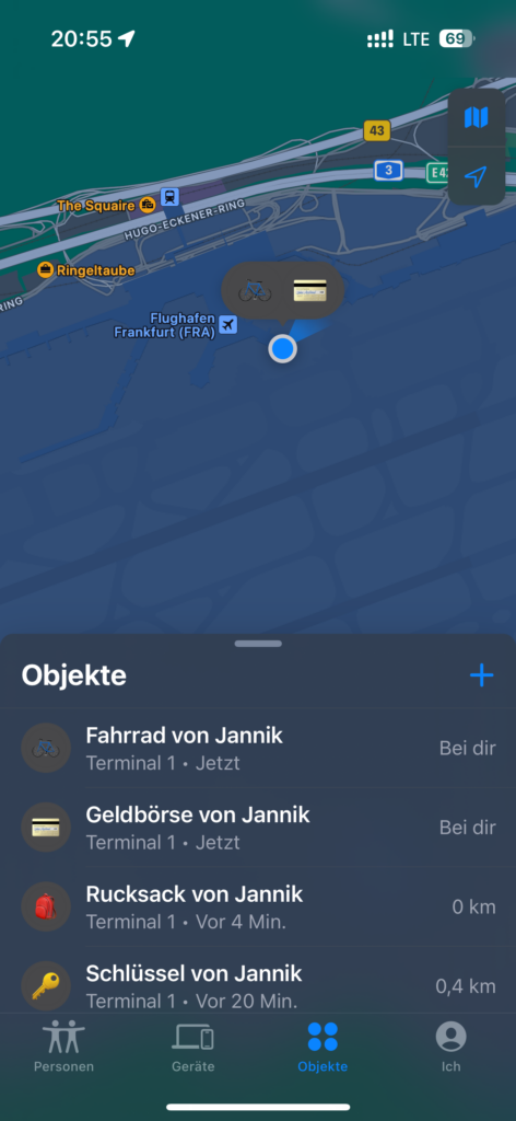 Glücklicherweise lief alles problemlos, und das Flugzeug landete pünktlich in Frankfurt. Zunächst hatte ich ein bisschen die Sorge, bei dem großen Flughafen mein Gate nicht rechtzeitig zu finden oder mich ganz zu verlaufen. Aber auch davon bin ich verschont geblieben und kam früh genug am Gate an. Auch meine Koffer sind mitgekommen, die ich dank der AirTags stets orten konnte. Zwar waren die Objekte nicht mehr richtig benannt, aber es war beruhigend zu sehen, dass alles in meiner Nähe war.