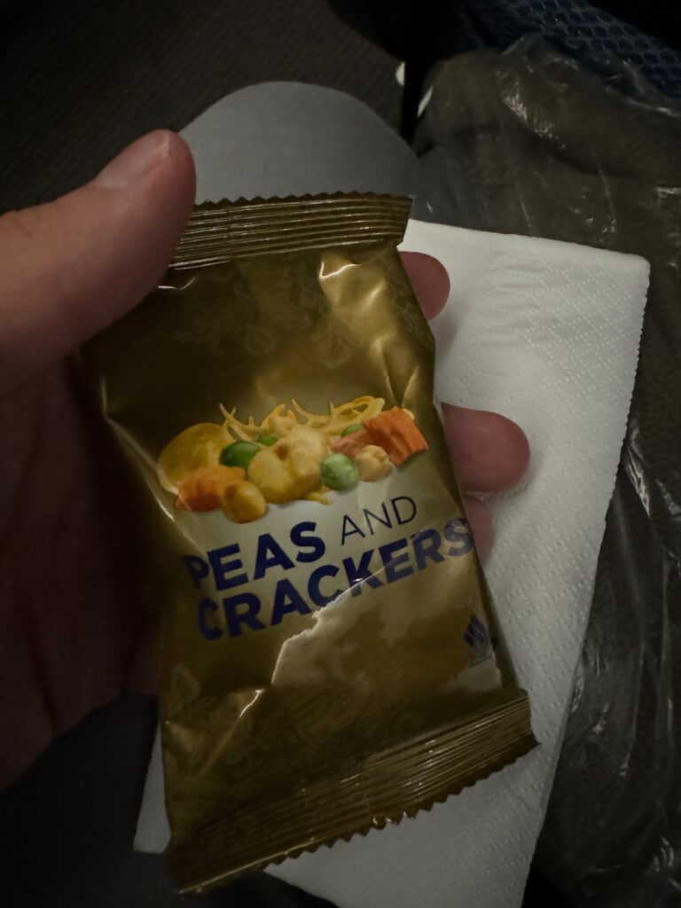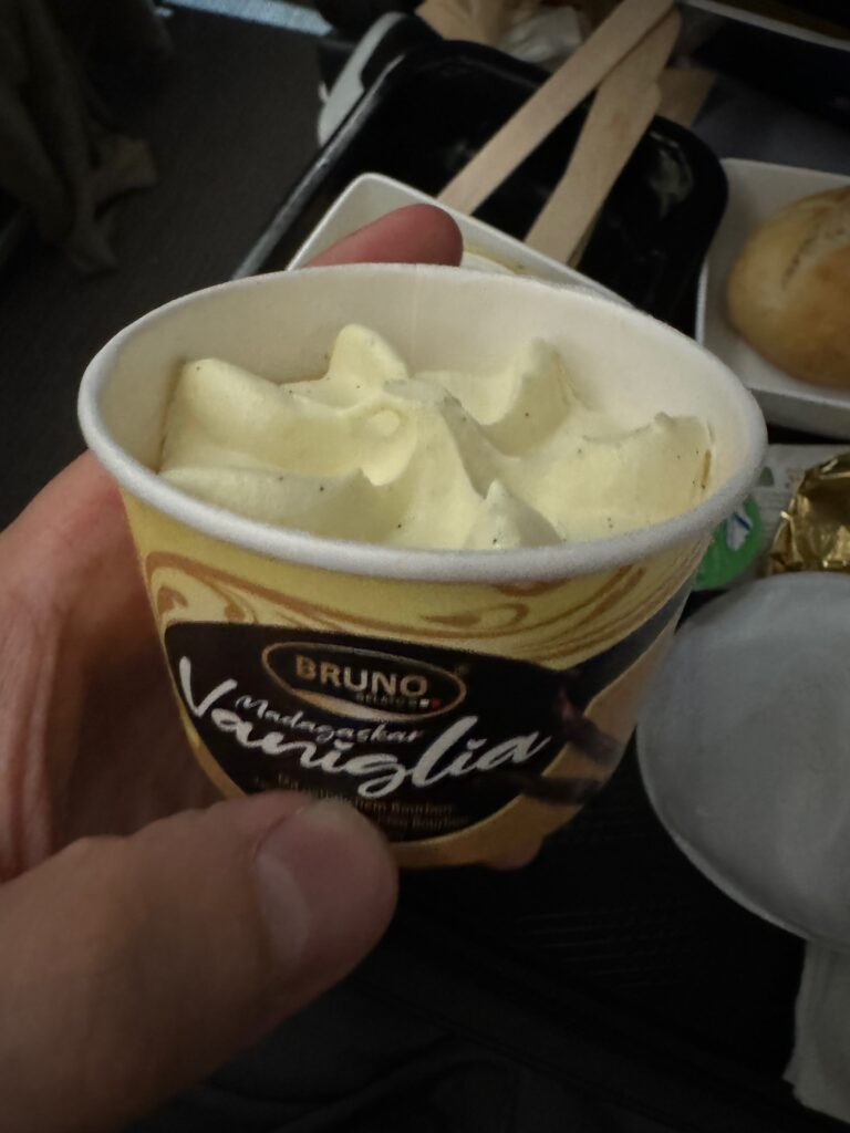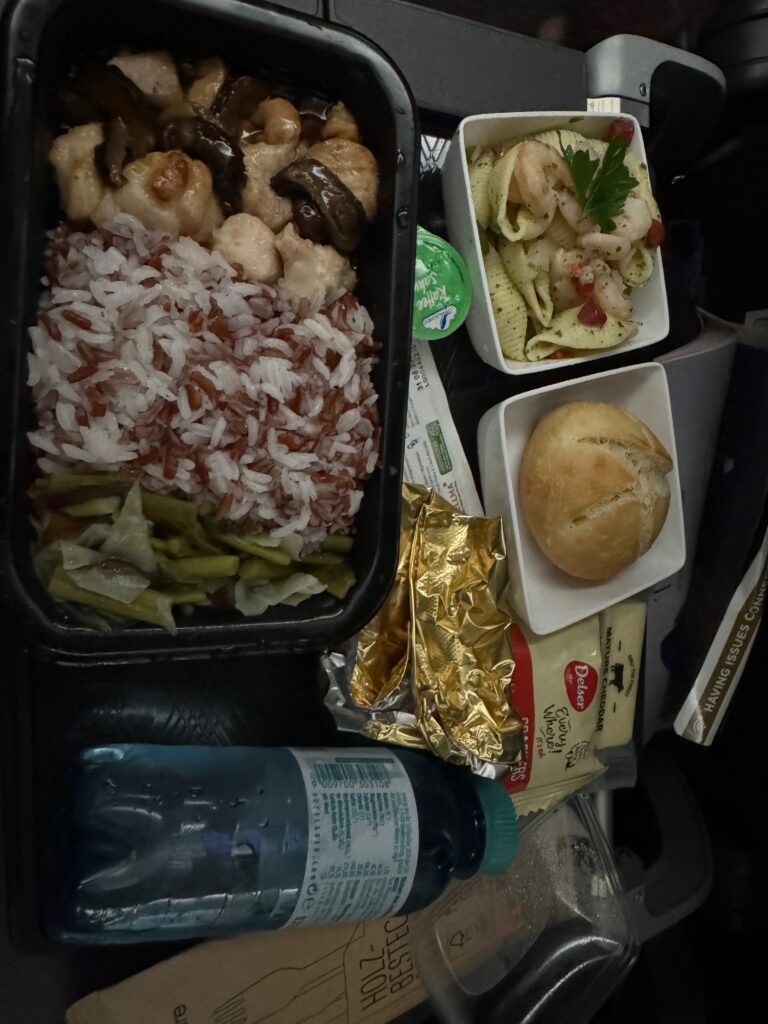 Die Crew war sehr aufmerksam und brachte kurz nach dem Start ein heißes Tuch und eine kleine Packung Knabberzeug. Getränke waren selbstverständlich auch immer erhältlich. Recht spät, nach 23 Uhr deutscher Zeit, wurde dann noch Abendessen serviert, das leckerer war, als es aussah. Zum Nachtisch gab es sogar noch eine große Portion Eis.